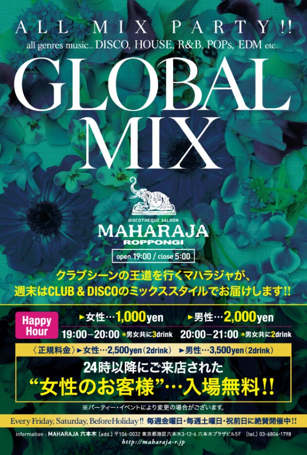 早い時間帯はディスコミュージック、深夜帯はクラブミュージックと2つの遊び方ができるALLジャンルイベント『GLOBAL MIX』。20代~50代まで幅広い年代のお客様が集まる週末のマハラジャ♪19:00~翌朝5:00まで営業なので、終電前にも後にも楽しめます。24時以降は女性入場無料!!