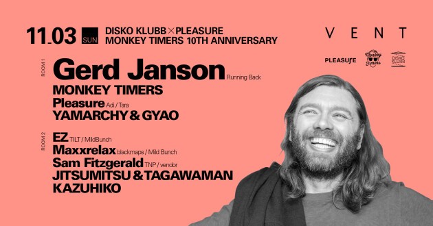 昨年のVENTでの来日公演での素晴らしいプレイも記憶に新しい中、各界の著名アーティストが認めるニュー・ハウス・シーンの頂点のDJによるプレイは今回も見逃せない。また、今回は今年でDJ活動10周年を迎えるMONKEY TIMERSとジャカルタのクリエイティブ集団 PLEASUREとタッグを組んだスペシャルな一夜となるだろう!