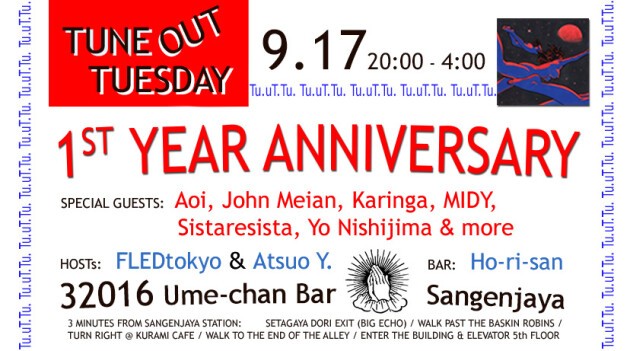 Tune ouT Tuesday = a monthly event on the 3rd Tuesday @ 32016 in Sangenjaya, Tokyo. DJ guests are local heroes & international rising stars.
