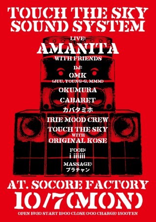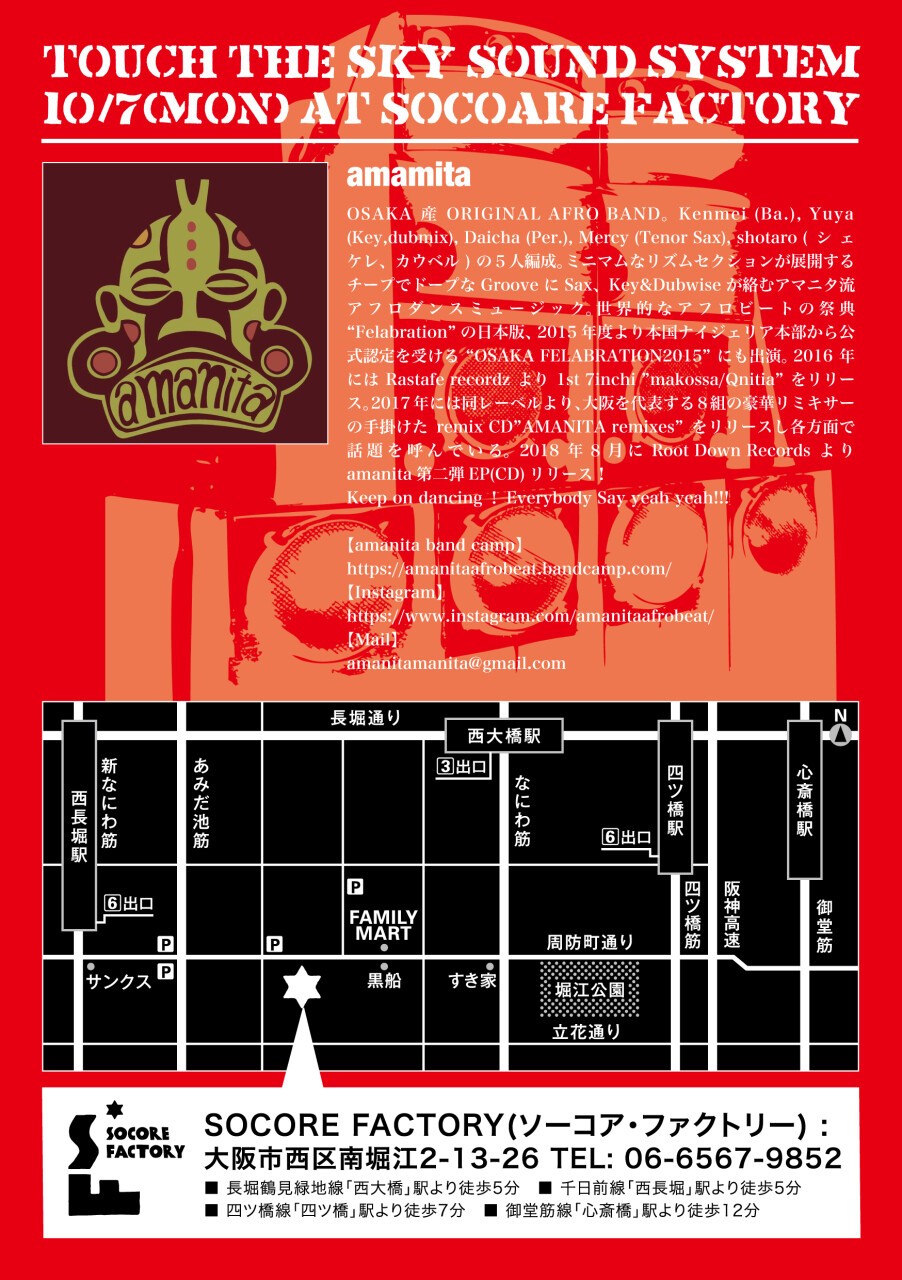 OSAKA産アフロビートを体現するバンドとしては珍しいドラムレスアフロバンド。Kenmei (Ba.Gaya), Yuya (Key,dubmix), Daicha (Per.), Mercy (Tenor Sax), shotaro (シェケレ、カウベル)の5人編成。ミニマムなリズムセクションが展開するチープでドープなGrooveにSax、Key&Dubwiseが絡むアマニタ流アフロダンスミュージック。