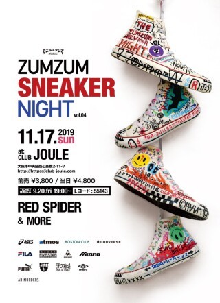 ZUMZUM SNEAKER NIGHT vol.4 2019.11.17(SUN) OPEN 17:00 DOOR ¥4,800- ADV ¥3,800- at club JOULE RED SPIDER HAN-KUN The BK Sound HISATOMI TAK-Z AIR KING