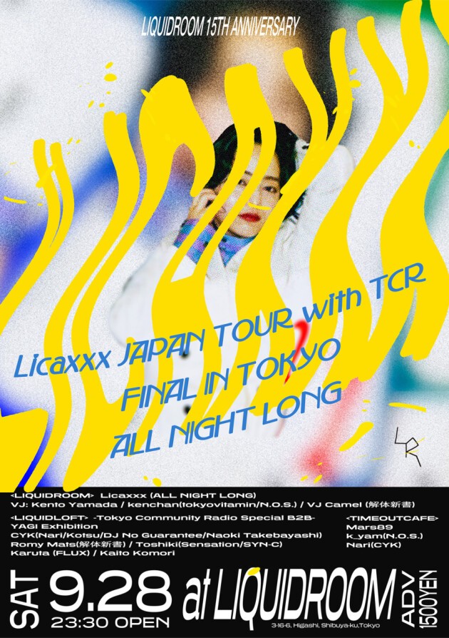 DJのLicaxxxが主宰する配信プラットフォーム「Tokyo Community Radio」 (以下、TCR)のローンチを記念し、全国各地を回るツアー「Licaxxx Japan Tour With TCR」。5月末よりスタートし、全国約20ヶ所を回っている。ツアー終盤を飾る東京と大阪はLicaxxx自身初となる、ワンマン公演を開催。1つのフロアを1人で一晩つくりあげる、オールナイトロングセットで挑む。