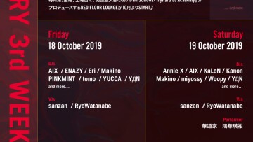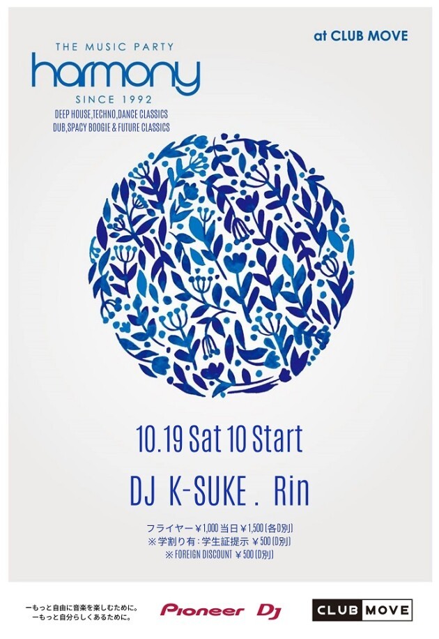 いつもより早い第3土曜日に開催のHARMONY。10月はディープハウスニュージェネレーションでありながらオールドスクールなハウスやクラシックスを好むRinとK-SUKEの2マンナイト。