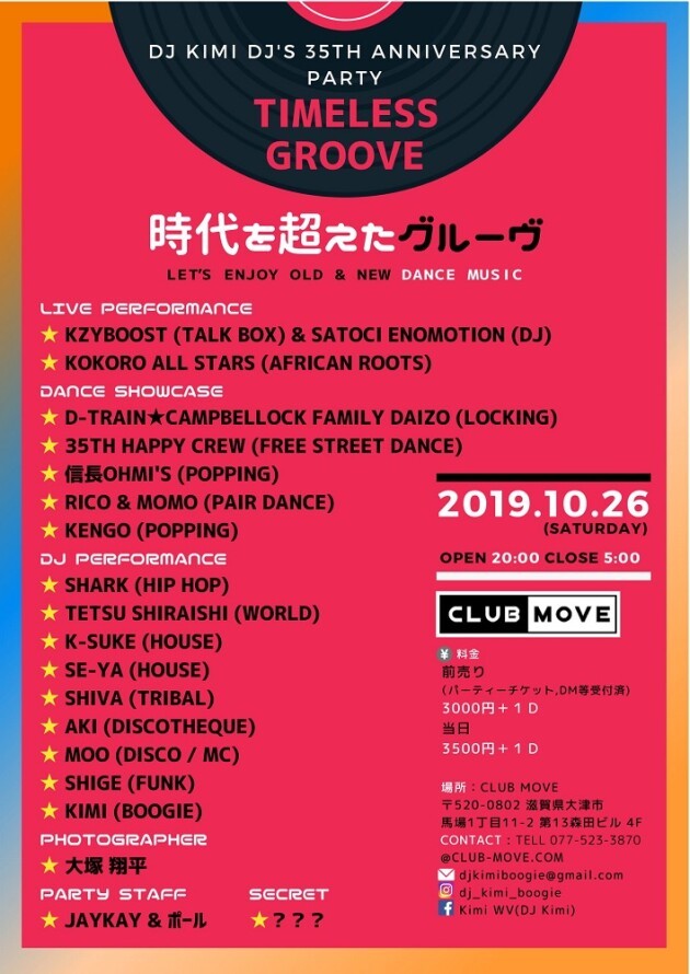 滋賀県大津市生まれ。CLUB MOVEオーナー兼DJ。86年頃DJ開始。沖野修也氏が店長を務めた京都CLUB"CONTAINER"を中心に大阪,滋賀で活動。95年"T-UP BAR"をオープン。その後,97年滋賀初本格的CLUB"CLUB MOVE"誕生。MOVEでプレイされた国内海外のレジェンドDJ達も音響設備は間違いないと絶賛されている。また本人のイベント"HARMONY"も今年令和で27年目。更にDJ歴33周年。