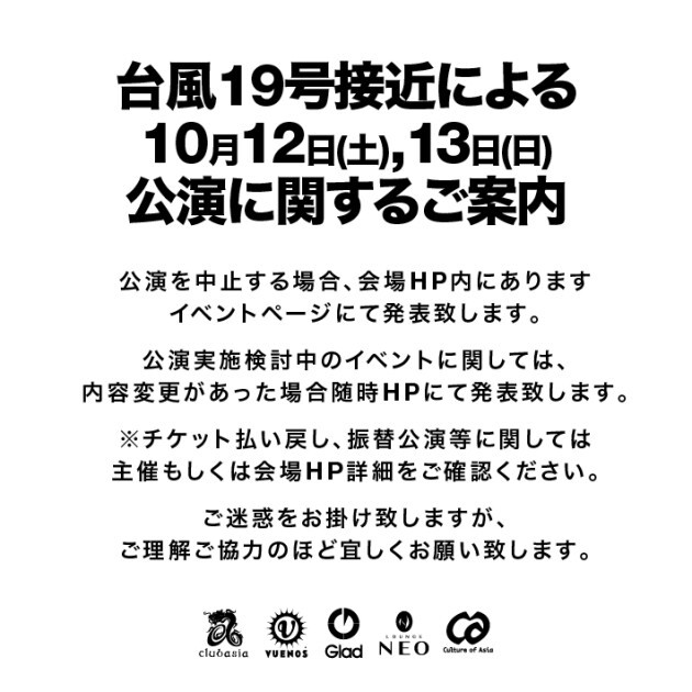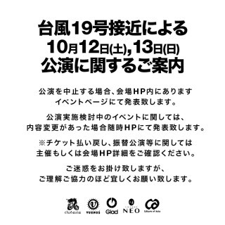 Gladはこの度の台風19号接近に伴い、お客様、アーティスト様の安全面を第一に考慮し営業を中止いたします。