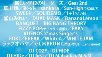 新しい学校のリーダーズ / Gear 2nd / 草川瞬 / 彩-xi- / Sun-High(0 SOUL 7) / SWEEP / SOLIDEMO / 1+1(ダブル)/ 當山みれい / DUAL MASK / BananaLemon / BANQUET / BIG BANG THEORY / FIZZY POP(ナチュラル炭酸) / FAKY / VUENOS X'mas Singer's / FUKI / FREAK / WhiteA / WHITE JAM / ラップオバケ / ёLЖBRUИCH(レオリ) ...and more!!!