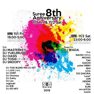 恵比寿Suree、8周年アニバーサリーパーティは11/1(金)&11/2(土)の2DAYS開催! 2日目となる土曜日は、DJ WADAをゲストに迎え、こちらもSuree馴染みのDJ陣が勢揃いするHOUSE& TECHNOナイト。