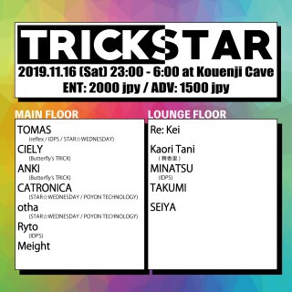 デビューして間も無くもその頭角を表し各所より絶賛されるDJ達を一同に集め、そのプレイを存分に楽しんでもらうをコンセプトにした新機軸イベント「TRICKSTAR」、フロアの空気はDJによって作り出されると言っても過言ではない中で、様々なトリックを使ったスターを目の前で体感できます!メインフロアでは激しいグルーヴ感たっぷりなハードサウンドを楽しみ、ラウンジフロアでは一息つける空間を保証します。是非、気鋭のDJによるプレイをご堪能下さい!