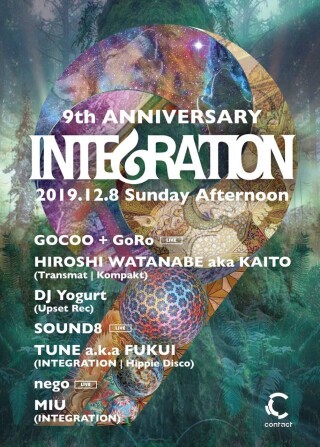 DJ/ライヴ/アートや出店など各種コンテンツの融合をコンセプトに、独自の空間を築き上げるパーティINTEGRATION。代官山Airの平日レギュラーパーティとしてスタートし、Circus Tokyo、Sankeys TYOでの開催を経てこれまで数々の豪華ゲストDJ&ライヴをフィーチャーすると同時に、Hiroshi Watanabe a.k.a KaitoとDJ Yogurtをレジデントに迎え開催都度に盛り上がりを見せてきたこのパーティも、10年目の歴史を刻もうとしている。