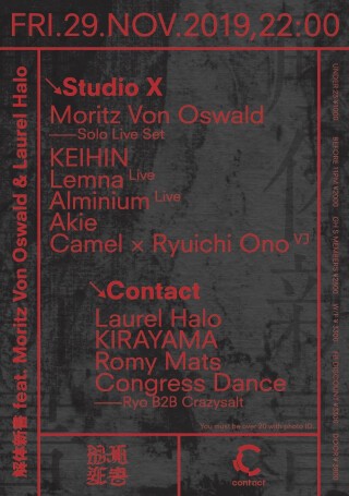 Studio Xには、Moritz von Oswaldが回顧的なサウンドで構成した最新ソロライヴで登場する。音の焦点となるのは、彼の数多ある功績の中でも未だ厚く称賛されるBasic ChannelやRhythm & Sound、Maurizioといったユニットプロジェクト、そしてレーベル〈Chain Reaction〉など、90年代以降の電子音楽の発展において極めて重要な音楽となった“ダブテクノ”。音の混成化がスタンダードになってもなお、テクノ~ミニマル~ダブの文脈の中でのBasic Channelの影響は計り知れないが、Moritz von Oswald Trio、Juan AtkinsとのBORDERLAND、キルギスの民族音楽グループOrdo Sakhnaとのコラボを経て、再び彼の手で鳴らされる“ダブテクノ”がいかなるものかには期待が高まる。共演には、今年10月にエクスペリメンタル・テクノ~ダーク・アンビエントを主導する〈Horo〉から、心酔に尽きる音像を納めた2つのEP「Retrocausality: A Priori / A Posteriori」をリリースしたLemnaのライヴセットや、主宰レーベル〈Prowler〉の設立とデビューEPと共にカムバックを果たした太く深く強靭なDJのKEIHINなどをフィーチャーする。