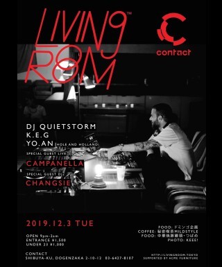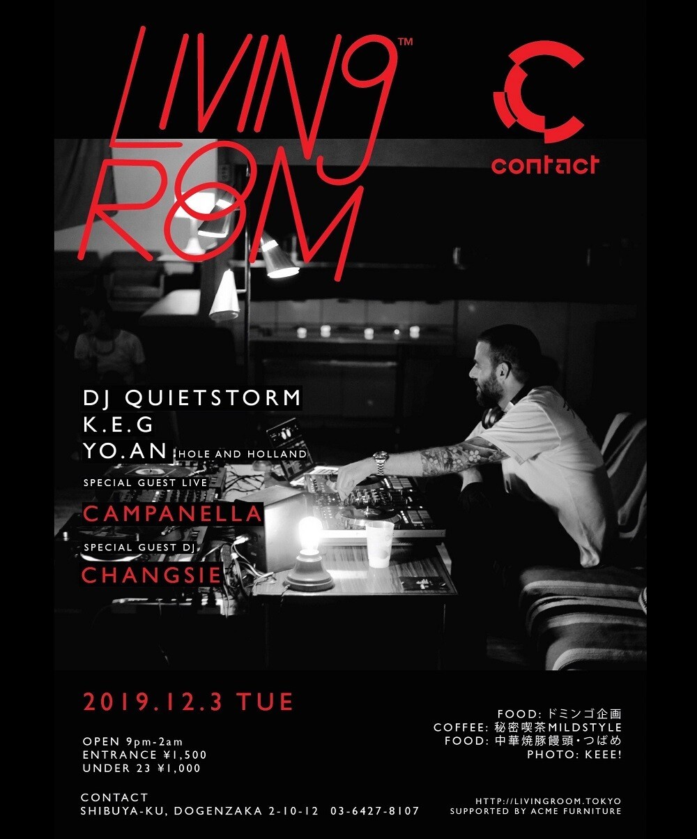 DJ Quietstorm、DJ K.E.G.、Nao、ドミンゴ企画、KEEE! が主催する、毎月第1火曜日のレギュラーパーティLIVING ROOM™ (https://livingroom.tokyo/)。