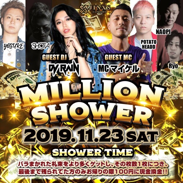 DJ RAINによる新たなALL MIX PARTY始動! バラまかれた札束をより多くゲットし、その枚数1枚につき、最後まで残られてた方のみ おかえりの際、100円に現金還元!