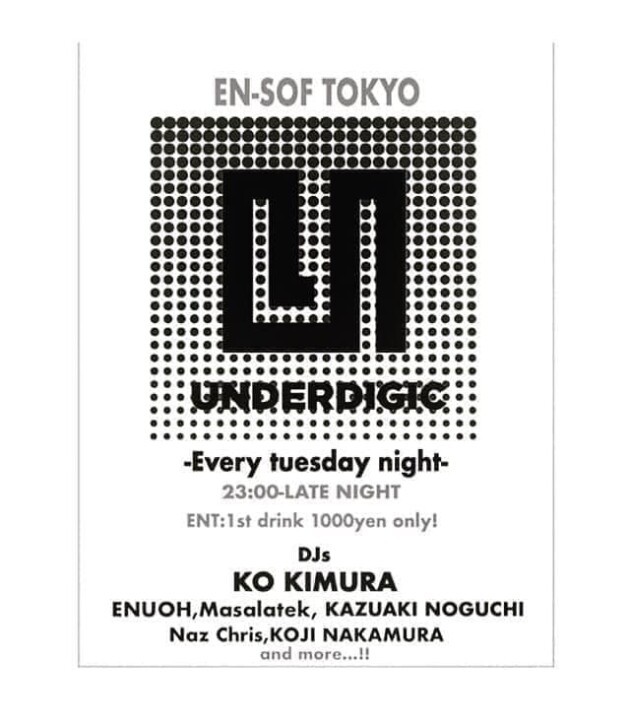 渋谷EN-SOF TOKYOにて毎週火曜日開かれるミュージックプロジェクト & パーティー『UNDERDIGIC』。House/Technoの新譜を中心とした良質なダンスミュージックを提供するのみならずアートやファッション等、パーティーを通じ楽しみながら様々な発信の場とする、というコンセプトのもとにスタートした。