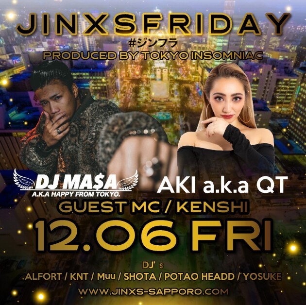 「眠らない首都=東京」を意味するHOTでSEXYなPARTY 【"TOKYOINSOMNIAC"】がNEW PARTY 【#ジンフラ】をJINXS SAPPOROで開催! GUESTには"MA$A a.k.a HAPPY"とMCは"KENSHI"が東京から出演!