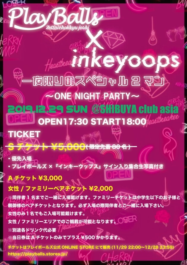 2部 Sチケット¥5,000(限定先着50名) ・優先入場 ・プレイボールズ×『インキーウップス』サイン入り集合写真付き