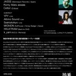 The UK techno flag-bearer Randomer made his way into the global scene through releases from Hessle Audio and Hemlock during the rise of the post-dubstep era, and in recent years from labels such as L.I.E.S and Clone. He returns to Japan along with JASSS, known for her releases on Mannequin and iDEAL. Her distinct style fuses afro/latin roots with industrial/EBM/experimental sounds. Extensive tours in 2019, including a gig for Kaitai-Shinsho in May where she tore up the dance floor, has opened new doors such as a residency at UK’s Rinse FM. Joining the headliners in Studio X, the splendid local act Celter is scheduled to set the mood with an opening set.