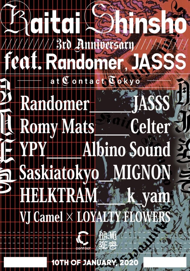 Curated by Romy Mats and VJ Camel, 解体新書 (Kaitai-Shinsho), the party focuses on various electronic music from around the world from their own unique perspective, enters their 3rd year in January of 2020. Their 3rd anniversary features Randomer and JASSS, along with local artists trusted and loved by Kaitai-Shinsho.
