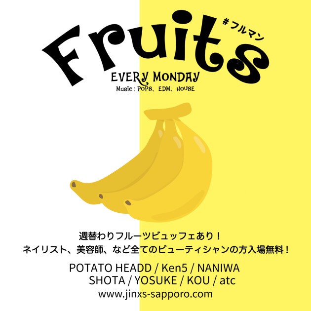11月から新たにスタートしたNEW PARTY『Fruit Monday』#フルマン 女性に優しい週替わりのフルーツビュッフェや週毎で変わるフルーツのオリジナルカクテルを お楽しみいただけます! 今回の#フルマンのゲストDJには「バナナマン」が登場!