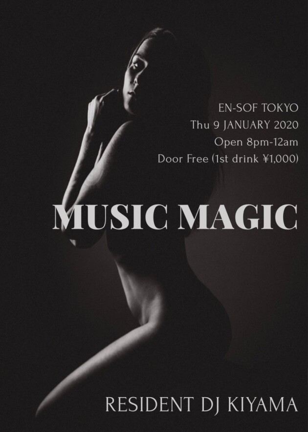 渋谷EN-SOF TOKYOにて毎週木曜日開催されている『MUSIC MAGIC』。ハウスを軸にダブ、ルーツ、ラバーズ、アフロ、ファンク、ソウル、ラテン、ブラジル、ジャズファンク、ロック、ニューウェーブ、80's等の新譜を中心に珠玉のレコードを厳選しプレイしている。ResidentのDJ KIYAMAは78年よりDJを開始し現在も都内のクラブ/バーを中心に精力的な活動を行なっている。これまでにJ WAVEやFM TOKYOのラジオ番組制作をはじめ、伝説のAIR FM、渋谷FMの開局に携わり、宇多田ヒカルのリミックスや楽曲のリリース等ダンスミュージックの発展に大きく貢献してきた。DJの中でも楽曲の知識は群を抜きハードディガーとしても知られるがショッピングモール等の商業施設、企業のレセプションパーティー、有線のアダルトコンテンポラリーまでコンセプトに合わせた選曲をこなす。レコードの扱いは非常に繊細でアーティストや楽曲に対する深い愛情とリスペクトを感じずにはいられない。