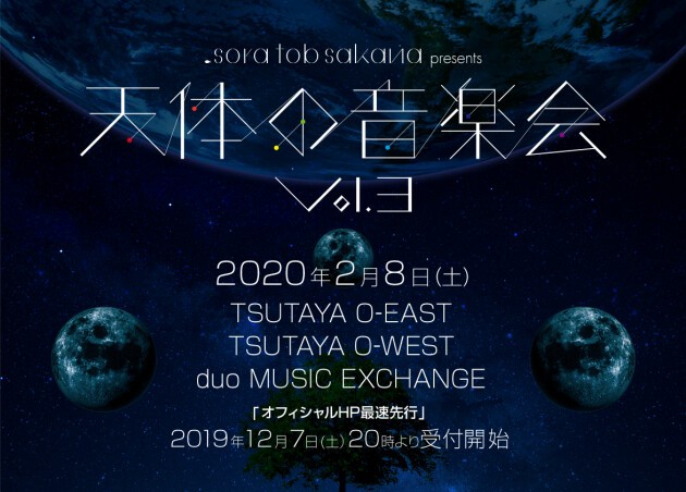 今年3回目となる大型フェスイベント「天体の音楽会Vol.3」が、 2020年2月8日(土)に渋谷・TSUTAYA O-EAST、 TSUTAYA O-WEST、 duo MUSIC EXCHANGEの3会場にて開催される。