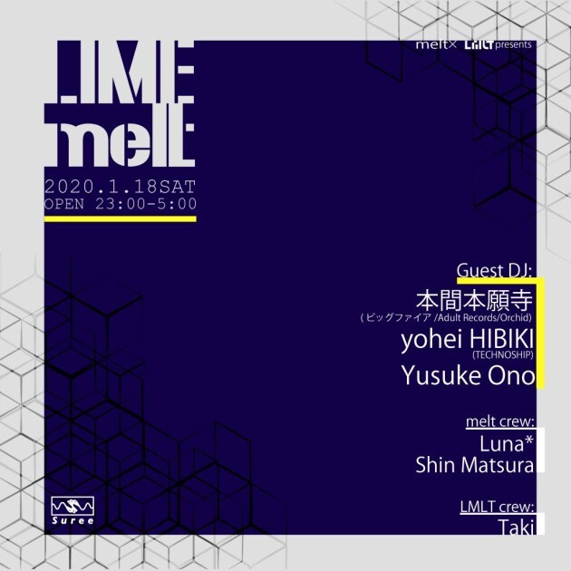 ゲストDJにはそれぞれ多方面で活躍し、LMLT・melt両イベントの世界観と共振する本間本願寺 (ビッグファイア/Adult Records/Orchid)とyohei HIBIKI (TECHNOSHIP)、そしてYusuke Onoが満を持して登場。