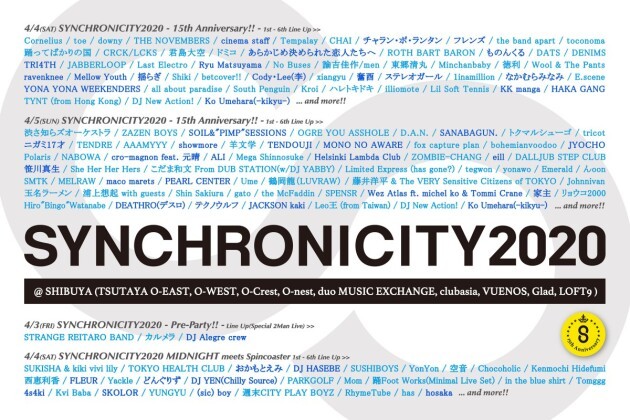 開催を予定しておりました4/3(金)『SYNCHRONICITY2020 – Pre-Party!! -』、4/4(土)、4/5(日) 『SYNCHRONICITY2020 – 15th Anniversary!! -』、4/4(土)『SYNCHRONICITY2020 MIDNIGHT meets Spincoaster』は、新型コロナウイルス感染拡大防止のため、開催中止とさせていただきます。