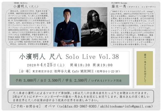 尺八奏者小濱明人によるソロライブ第38弾。1部は尺八の古典本曲をたっぷりと、2部はゲストにギターの藤本一馬さんをお迎えしお送りします。藤本さんの深く美しい音楽世界と尺八の叙情が溶け合う耽美の世界をお楽しみ下さい。