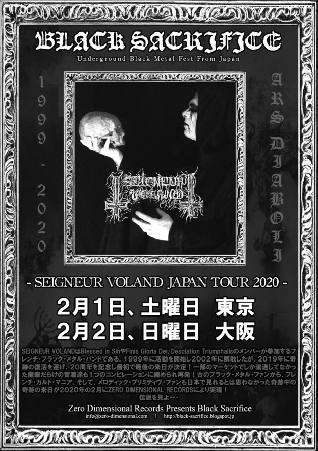 SEIGNEUR VOLANDはBlessed in SinやFinis Gloria Dei, Desolation Triumphalisのメンバーが参加するフレンチ・ブラック・メタル・バンドである。1999年に活動を開始し2002年に解散したが、2019年に奇跡の復活を遂げ、20周年を記念し最初で最後の来日が決定!一部のマーケットでしか流通してなかった廃盤だらけの音源達も1つのコンピレーションに纏められ再発!古のブラック・メタル・ファンから、フレンチ・カルト・マニア、そして、メロディック・プリミティヴ・ファンも日本で見れるとは思わなかった奇跡中の奇跡の来日が2020年の2月にZERO DIMENSIONAL RECORDSにより実現!