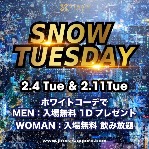 雪まつりシーズンの火曜日は特別営業決定!『SNOW TUESDAY』が開催! ホワイトコーデで男性は入場無料(1D付き)、女性は入場無料(飲み放題付き)の特典がついてくる!! 雪まつりの後は是非JINXS SAPPOROまでお越しくださいませ。