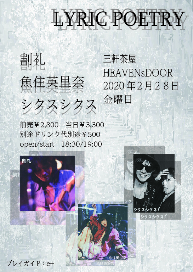 常軌を逸した超スロウテンポなヘヴィーグルーヴで圧倒的に突出した世界観を放出するジャパニーズインディー界の重鎮『割礼』を中心に、注目度急増中のリアルイズム赤裸々系インスピレーション突き付けガール『魚住英里奈』、静寂と狂気が同居するモダンアシッドフォークユニット『シクスシクス』が登場!これを観ずして現代のサイケデリックは語れない超注目の夜!!