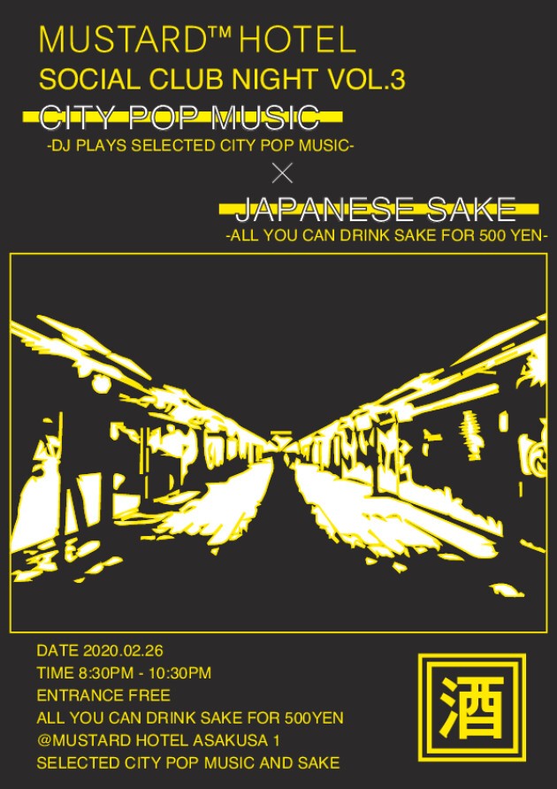 MUSTARD HOTEL ASAKUSAで開催されているCITY POP MUSICと日本酒をテーマにしたレギュラーイベント。 3回目となる今回は「MUSTARD HOTEL ASAKUSA1」での開催。フリーエントランスに加え500円で日本酒飲み放題の特典付きです。