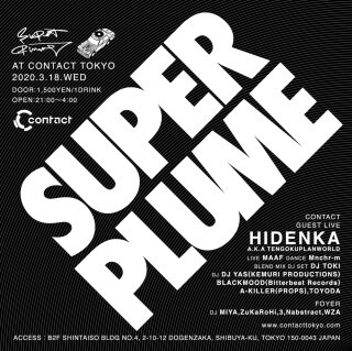 ファンク、スピリチュアル/フリー・ジャズ、ブルースからロック、ダブ、R&Bと膨大な音楽情報をジャンルではなく音として複層的に構築するラッパー/ビートメイカーの鬼才HIDENKAがSuper Plumeに初登場。DJ Yasを筆頭に、BLACKMOOD、A-KILLER、Toki、Toyodaといった手練れと、Mnchr-mによるダンス、ラッパーMAAFといったSuper Plumeレギュラー陣との音の交換は、想像を超えた奇跡的な産物を期待させる。