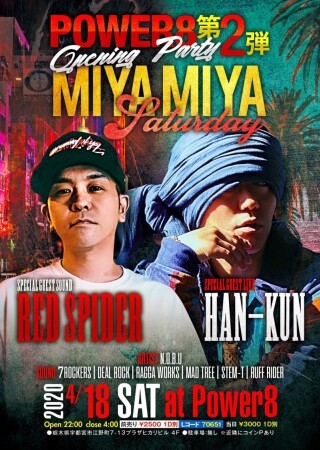 MIYA MIYA SATURDAY POWER8 opening party 第2弾 Special Guest Soundに「RED SPIDER」 Special Guest LIVEに「HAN-KUN」