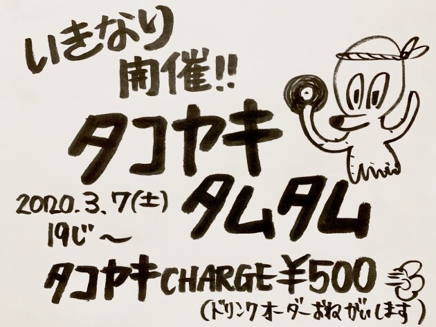 出店がコロナの影響で無くなったので急遽お店で『たこやきタムタム』開催!たこ焼きチャージ500円でなんと食べ放題!無くなり次第終了です☆ドリンクオーダーおねがいします◎食材持ち込み大歓迎‼DJはみっちゅん。♫飛び込みDJも大歓迎♬