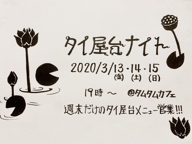 3月13日金曜〜15日日曜は2年振りに『タイ屋台ナイト』やります!メニューは定番のトムヤムクンからイサーン料理まで色々と☆14日土曜は来月タムタムでPartyの予定もあるオトモレザカクルーがDJ、15日日曜はOPAL7くんがタイ音楽縛りでDJしてくれます♫13日金曜はブース開放しているので飛び込みDJ大歓迎〜◎