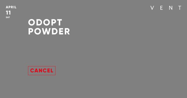 VENTは新型コロナウイルスの感染拡大防止に伴い、4月11日に予定しておりました”Odopt & Powder”公演を開催キャンセルとさせて頂きます。