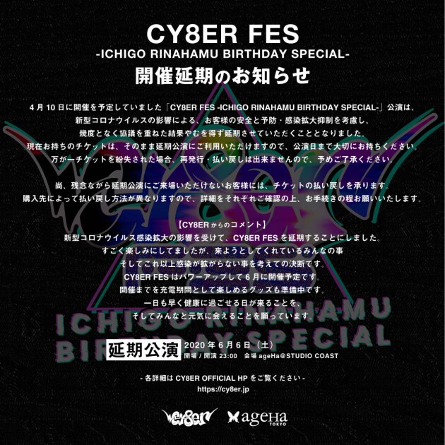 4月10日に開催を予定していました「CY8ER FES -ICHIGO RINAHAMU BIRTHDAY SPECIAL-」公演は、新型コロナウイルスの影響による、お客様の安全と予防・感染拡大抑制を考慮し、またageHaとしての4月25日までの営業自粛発表に伴い、幾度となく協議を重ねた結果やむを得ず延期させていただくこととなりました。