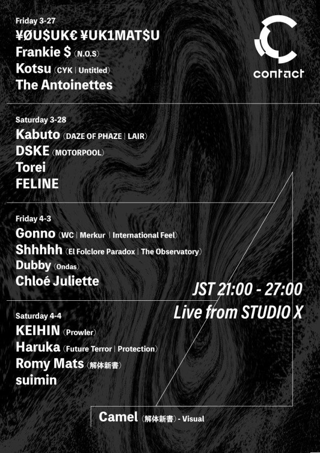 世界で猛威をふるう新型コロナウイルス感染防止への配慮、行政からの不要不急の外出自粛要請、海外からの渡航禁止による、アーティストの公演キャンセル等の状況を踏まえて、Contactは3月25日(水)から4月6日(月)の間、休業することに致しましたが、このような状況下でも皆様とともに音楽を共有したく、Studio Xから無観客にてライヴ配信を行いますので、ぜひご覧いただければ幸いです。
