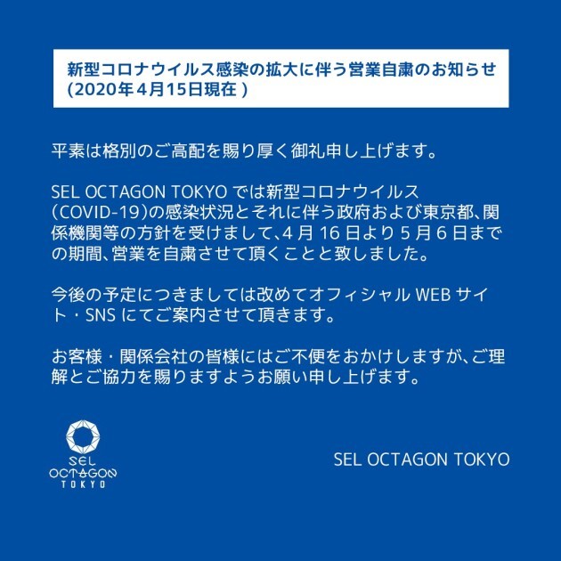 SEL OCTAGON TOKYO will suspend operations from April 16 to May 6 in accordance