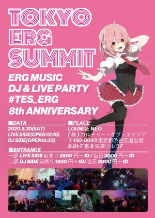 TOKYO ERG SUMMIT、それは2012年から始まったユーザー側からPC美少女ゲームの音楽カルチャーを推進するプロジェクト。シンガー中心のLIVE SIDEとDJが盛り上げるDJ SIDEの二部構成、様々な要素で盛り上げる美少女ゲーム系音楽イベントです。"DJ CULTURE "や"CLUB PARTY"の文化も含めたファンアートや音楽文化も含めて現場から発信します。