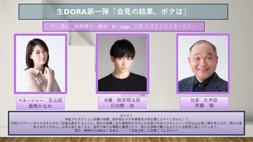 生DORAとはリアルtimeにてお送りをするドラマのことであり、舞台のようでドラマのようでという形式。更に今作は時間までも今まさにというスキャンダル記者会見前の事務所の様子から記者会見を描いた内容となっている。視聴者様はリアルtimeにてコメントも出来、そのコメントが物語に反映されることもあるかも!?乞うご期待!!