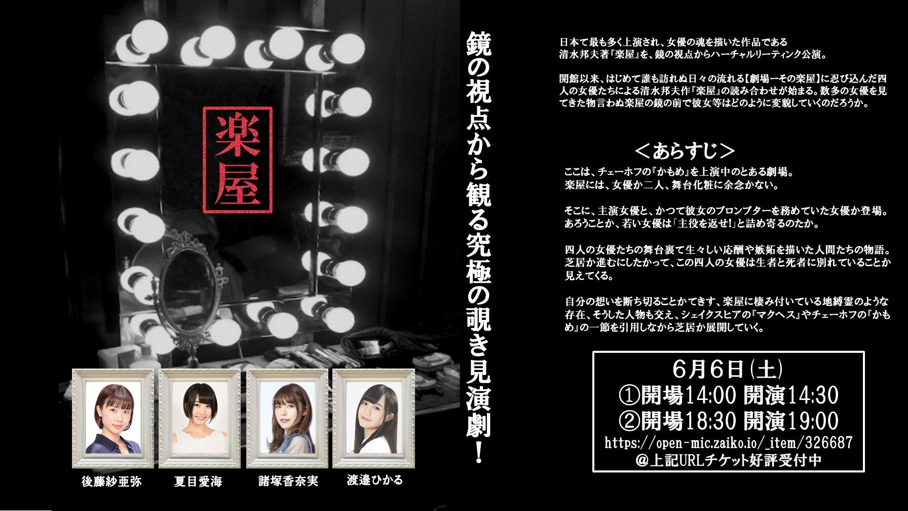 日本で最も多く上演され、女優の魂を描いた作品である清水邦夫著『楽屋』を、鏡の視点からバーチャルリーディング公演として行う。