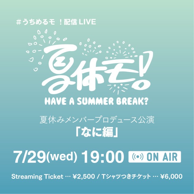 ゆるめるモ!がちょっと早い夏休みに、メンバープロデュース公演「夏休モ!」を開催!今回はなに編!なにがセットリストを決めて、チェキではなにがメンバーに着て欲しい衣装を指定しそれを全員で着ます!どんな曲が入るのか&どんな衣装になるのかお楽しみに!更に今回はプロの撮影チームの方にお願いして、よりクオリティの高い映像で皆様のおうち時間を盛り上げる配信にします!