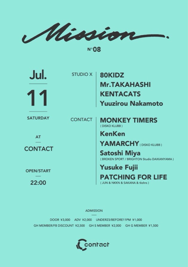 様々なシーンの垣根を越えて活躍を続ける80KIDZが主催する“MISSION”の第8回目。新曲を続けてリリース中の80KIDZ、DISKO KLUBB主催MONKEY TIMERS、人気パーティーEDGE HOUSEにレギュラー出演しているMr.TAKAHASHIとKENTACATS等に加え、ベーシストKenKenがDJとして出演。Contactフロアでは80KIDZのメンバーJUN率いるモジュラー・シンセ・ユニットPATCHING FOR LIFEがライヴを披露する。