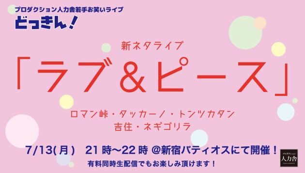 トンツカタン・吉住・ロマン峠・タッカーノ・ネギゴリラによる新ネタライブ「ラブ&ピース」開催!
