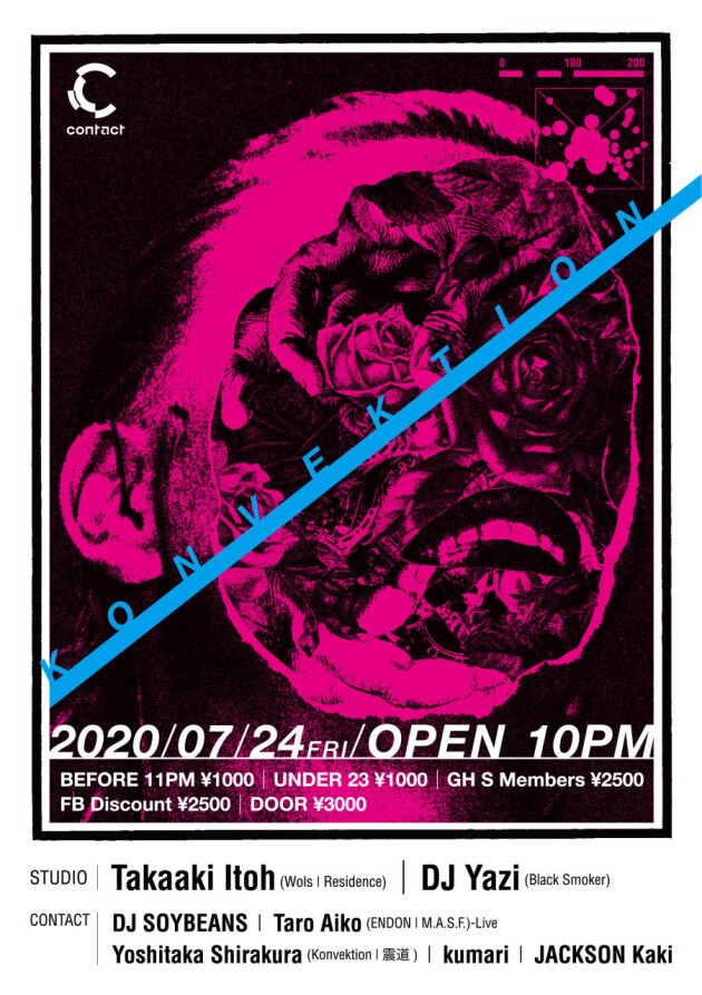 Konvektion began its journey in August of 2016 with precise curation inviting artists such as Function, Kobosil, Henning Baer, Inigo Kennedy, and has been living up to the expectations of techno fans. It is also an important platform for local experimental artists, as well as for listeners, to explore various electronic music styles and has been continuing to evolve and adapt to the current Japanese club scene. This edition features long sets by residents Takaaki Itoh and DJ YAZI in the main floor. Takaaki Itoh’s deep and driving style and DJ YAZI’s precision and storytelling style will ensure a night of pure techno music. In the bar area, DJ SOYBEANS, Yoshitaka Shirakura, kumari, JACKSON Kaki, and a live set by M.A.S.F. audio equipment developer Taro Aiko. The bar area will focus on experimental, noise, the creativity and the possibilities of electronic music. The high quality techno party returns to Contact.