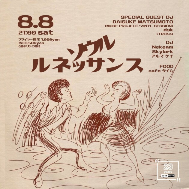そして、サポート役として迎えるは、CLUB MOVEの企画MIX CDも非常に好評だったDJ Nekeam、長年活躍し常に安定して素晴らしい選曲でCLUB MOVEにもゆかりの深いSkylark、DJそして、アルマ ケイの個性の異なる五人のDJでお送りします。