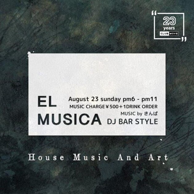 ※CLUB MOVEでは3密イベントは自粛の上、しばらくはDJ BARスタイルの営業とさせていただきます。 8/23(日) El Musica Meeting (HOUSE,and more...) PM 6 START PM 11 CLOSE MUSIC CHARGE ¥500+1DRINK ORDER MUSIC by きんぱ