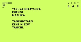 Takuya Hiratsuka、Phenol、Mazlika、Yagishotaro、kent niszw、YANCHI.が9月25日のVENT BARに登場!
