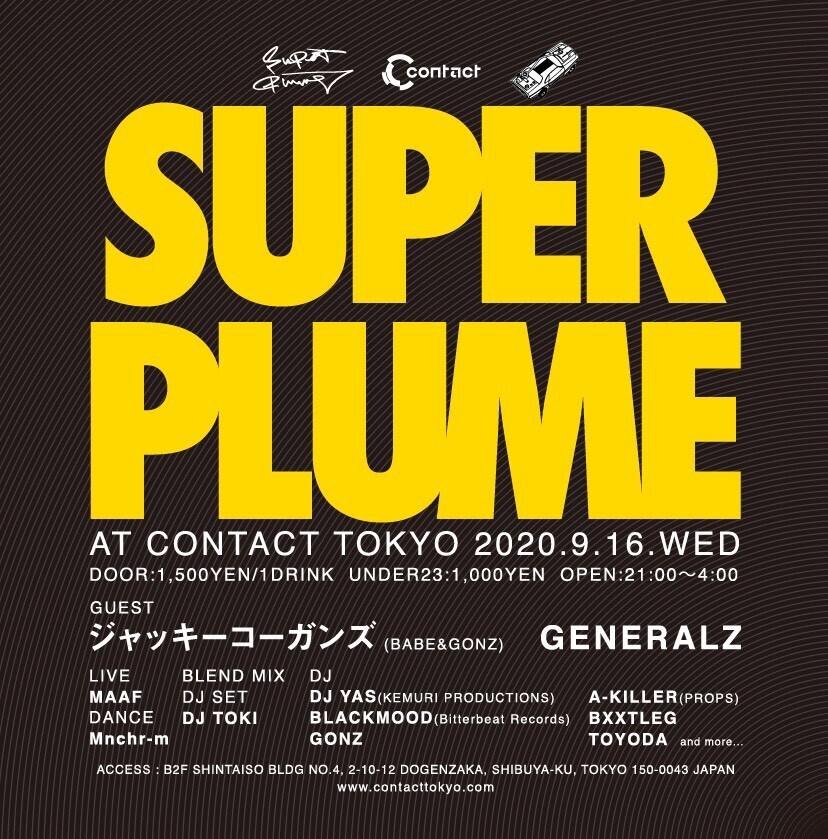 腰の据わったヒップホップ、ダブ、ソウル等、硬軟織り交ぜた自在のイマジネーションと池袋BEDでのP.Aキャリアを持つサウンドマニア、DJ Gonzと、池袋 伝説建設のラッパーBabeという悪友による夢のタッグ、ジャッキーコーガンズが登場。さらに中目黒から、小宮守、3、B××TLEGも所属する謎の黒いヒップホップ同盟GENERALZも参戦。ドープなサウンドを鳴らすこの二組がSuper Plumeを乗っ取る。DJ Yasを筆頭に、BLACKMOOD、A-KILLER、Toki、Toyodaといった手練れと、Mnchr-mによるダンス、ラッパーMAAFといったレギュラー陣との交錯にあまりにも濃厚な時間が流れる。今回もブラックミュージック/ヒップホップを基軸にしながらもクロスオーバーなスタイルを提案する。